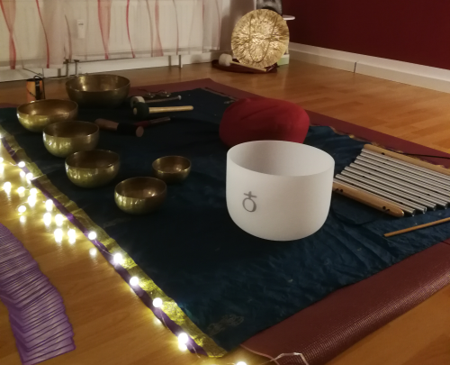 Tauche ein in die Welt des Klangs und lass dich von den heilsamen Tönen und Schwingungen der Klangschalen, des Windgongs und anderer Instrumente umhüllen.